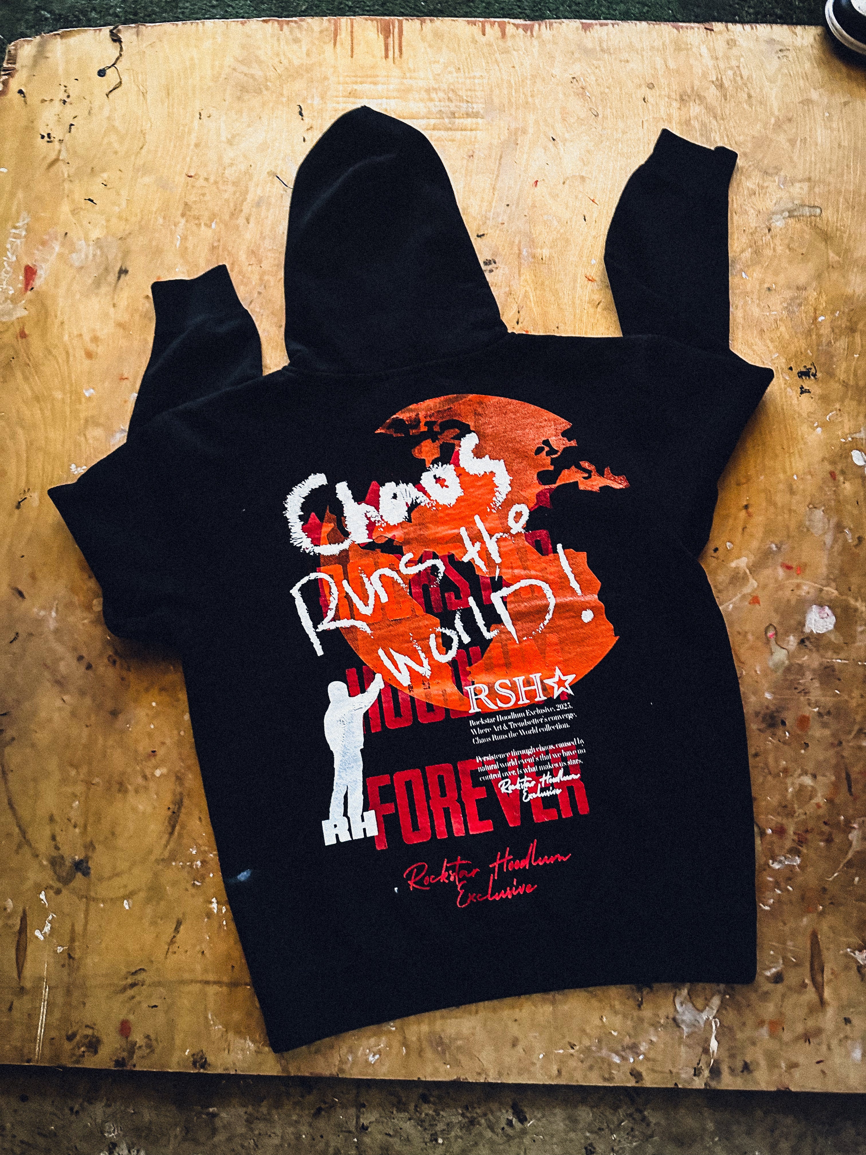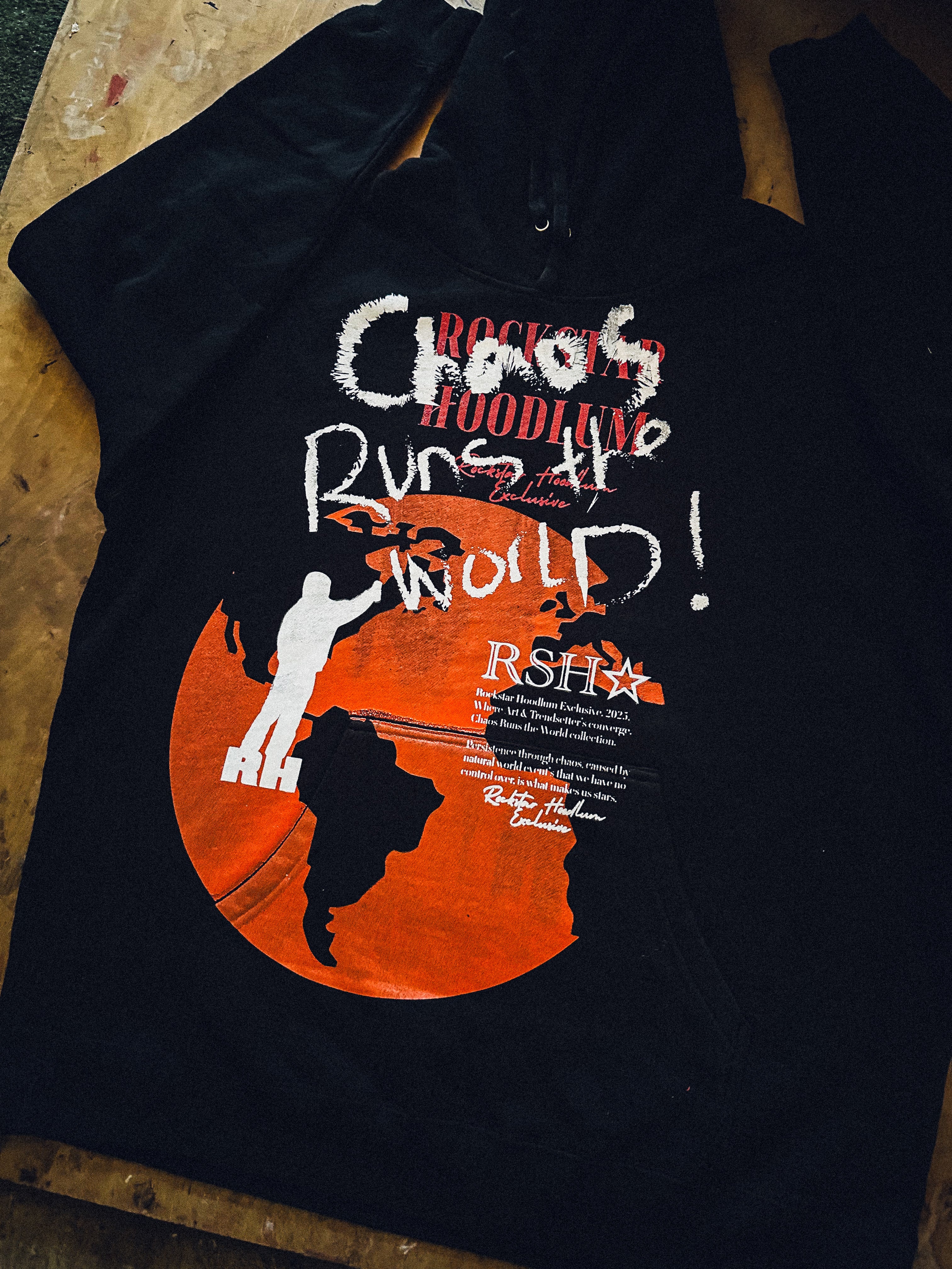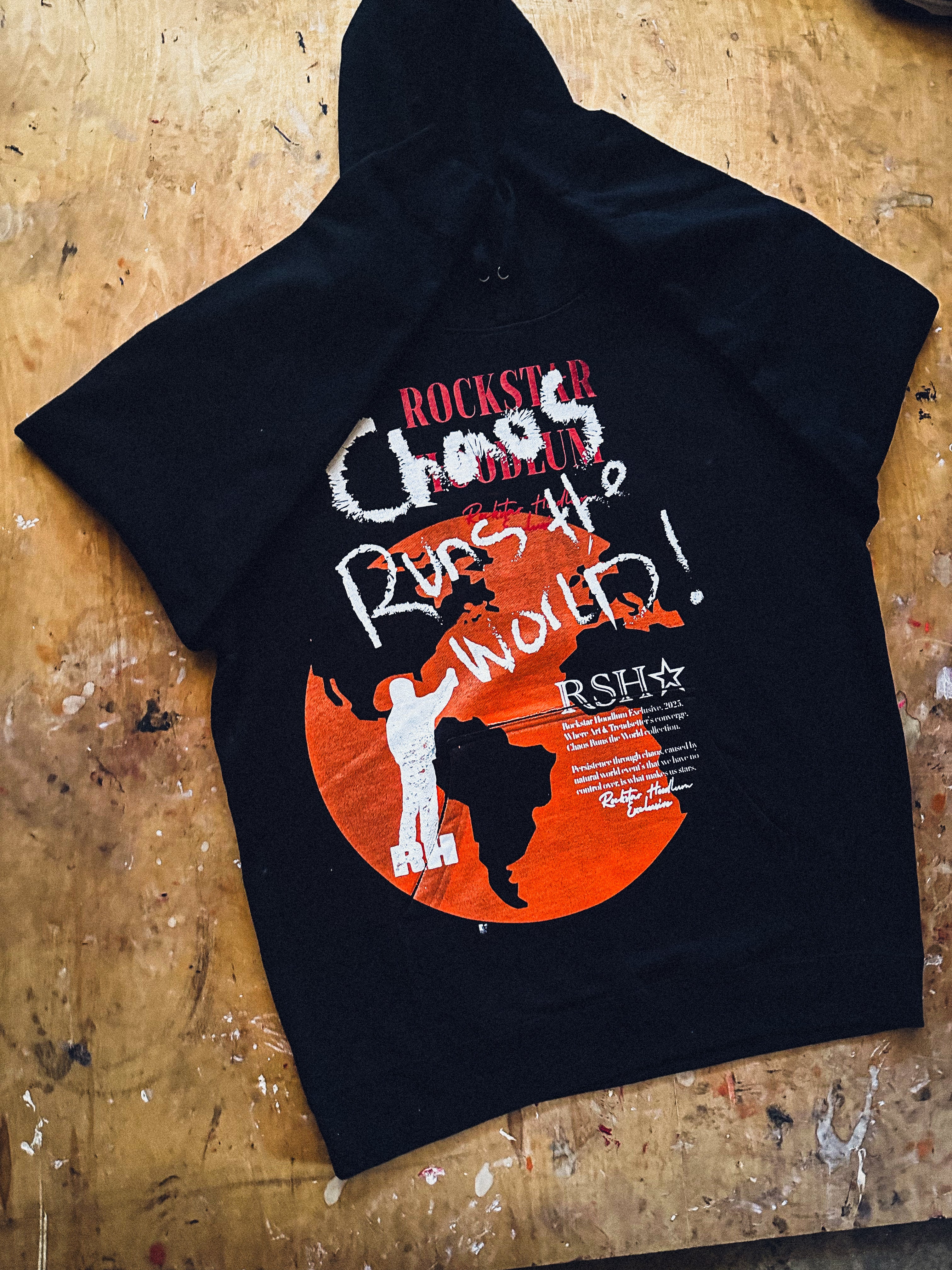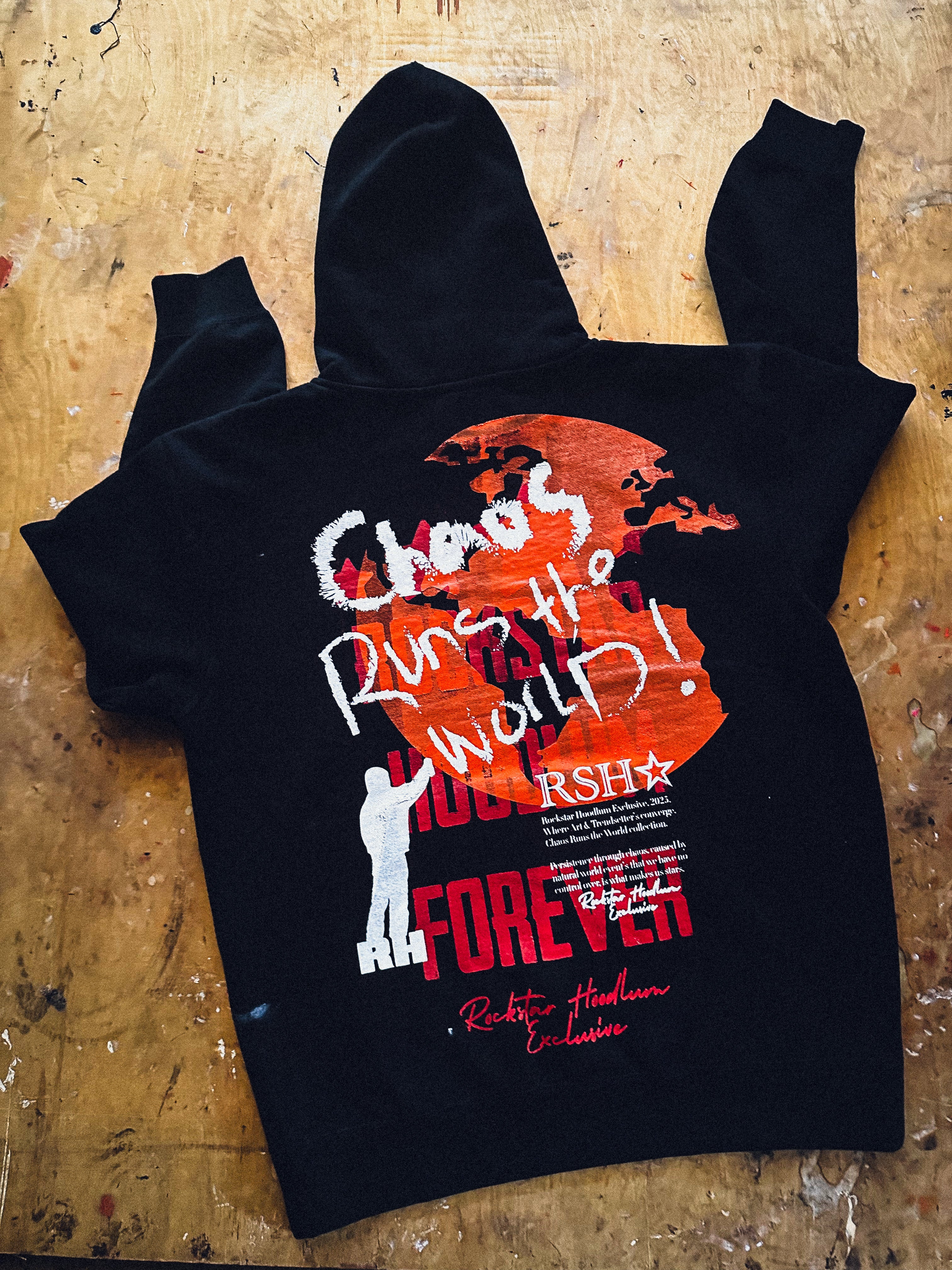 Rockstar Hoodlum’s “Chaos Runs the World” hoodie is now here! Within the explosive red font & burning orange world this sweater explains the world’s emotions in few words. “ Chaos runs the world.” We are here to stand together and overcome hardships; to prevail and conquer.
